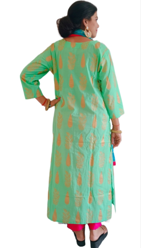 The Cotton fabric in this attractive GREEN/GOLD /FUCHIA color ready to wear Kurta Set will make sure that the fitting of this beautiful readymade Kurta Set looks elegant on you. Crafted from Cotton fabric, it is light in weight and will be soft against your skin. Its unique design and beautiful colour will fetch a lot of second glances as you club it with contrast colored pumps and flashy accessory. Our Products are Made and stitched using high grade fabrics and yarns under the strict surveillance of our well-versed Executives. It is capable of making you look gorgeous. Wear it and put your step in the world of fashion. It looks stunning every time you match it with accessories.
